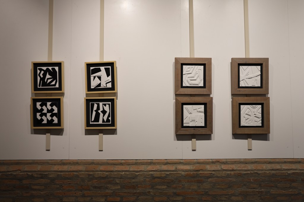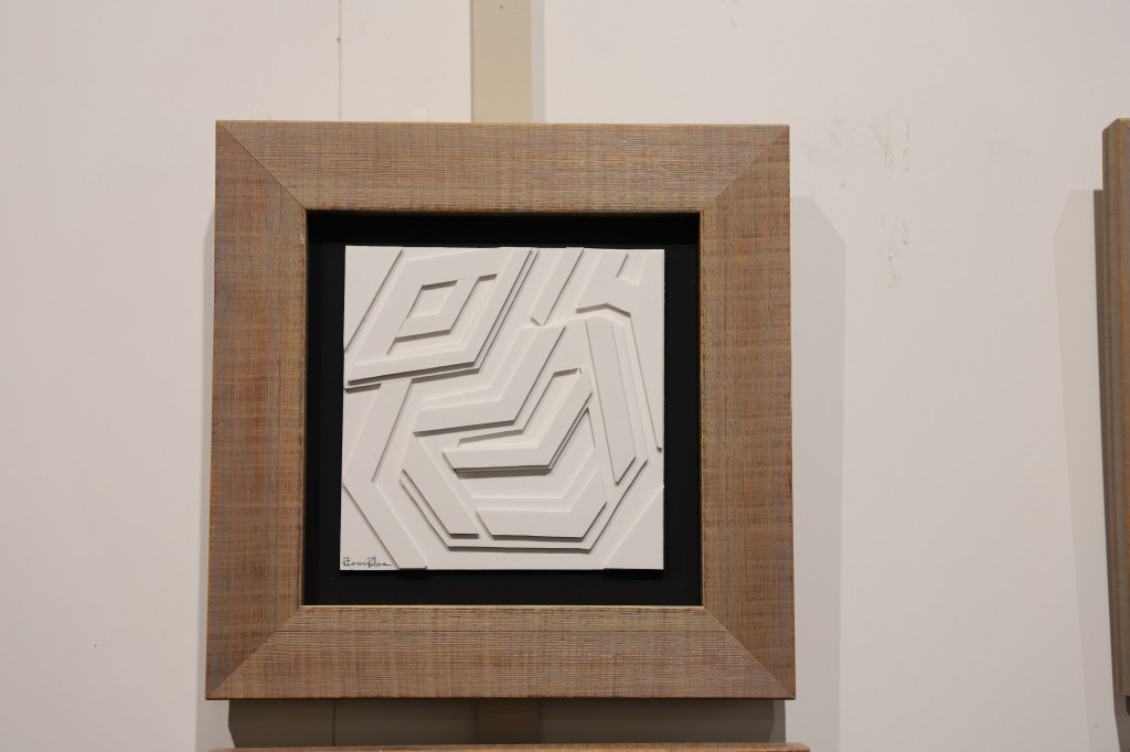 En esta ocasión nos presenta sus nuevas obras en el ya habitual formato de 20×20, seña de identidad de A.Casares Palma, pero con nuevos materiales, en los que investiga con la superposición de formas geométricas. El pintor ha elegido el blanco como único color para su obra, lo que le permite centrarse en la textura y la forma de las piezas. Las formas geométricas se superponen de manera irregular, creando un efecto tridimensional que parece expandirse más allá del lienzo.